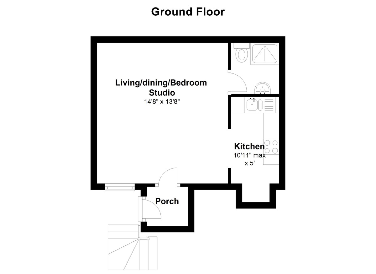 Excellent convenient bolthole, studio self-contained basement flat having open plan living/bedroom: Kitchen: Shower room & WC: Front garden area: