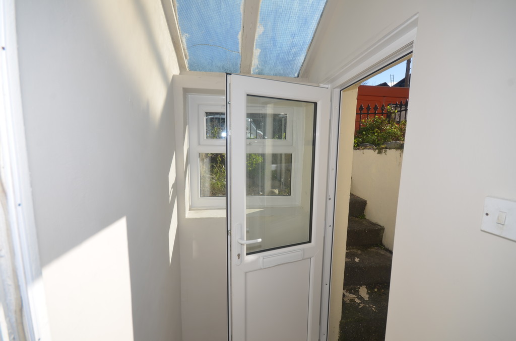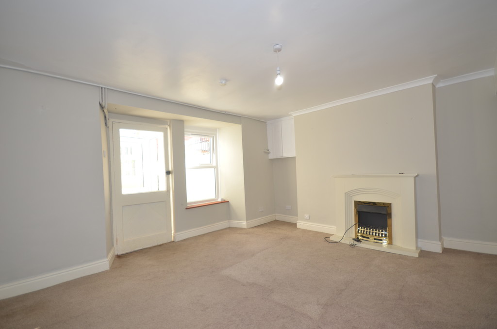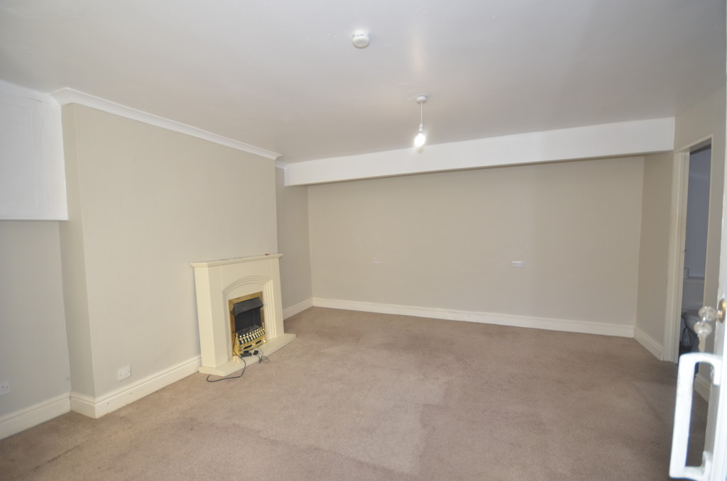 STUDIO LIVING/BEDROOM 14′ 8″ x 13′ 10″ (4.47m x 4.22m) Half glazed front door. Side window. Feature fireplace surround with electric fire.